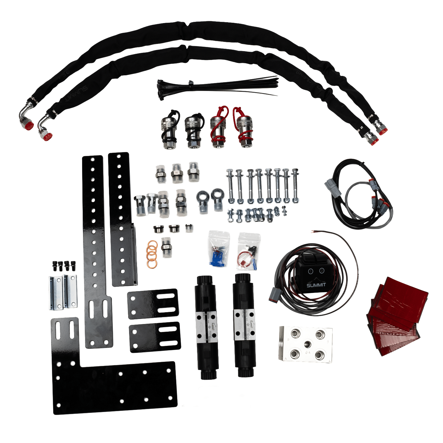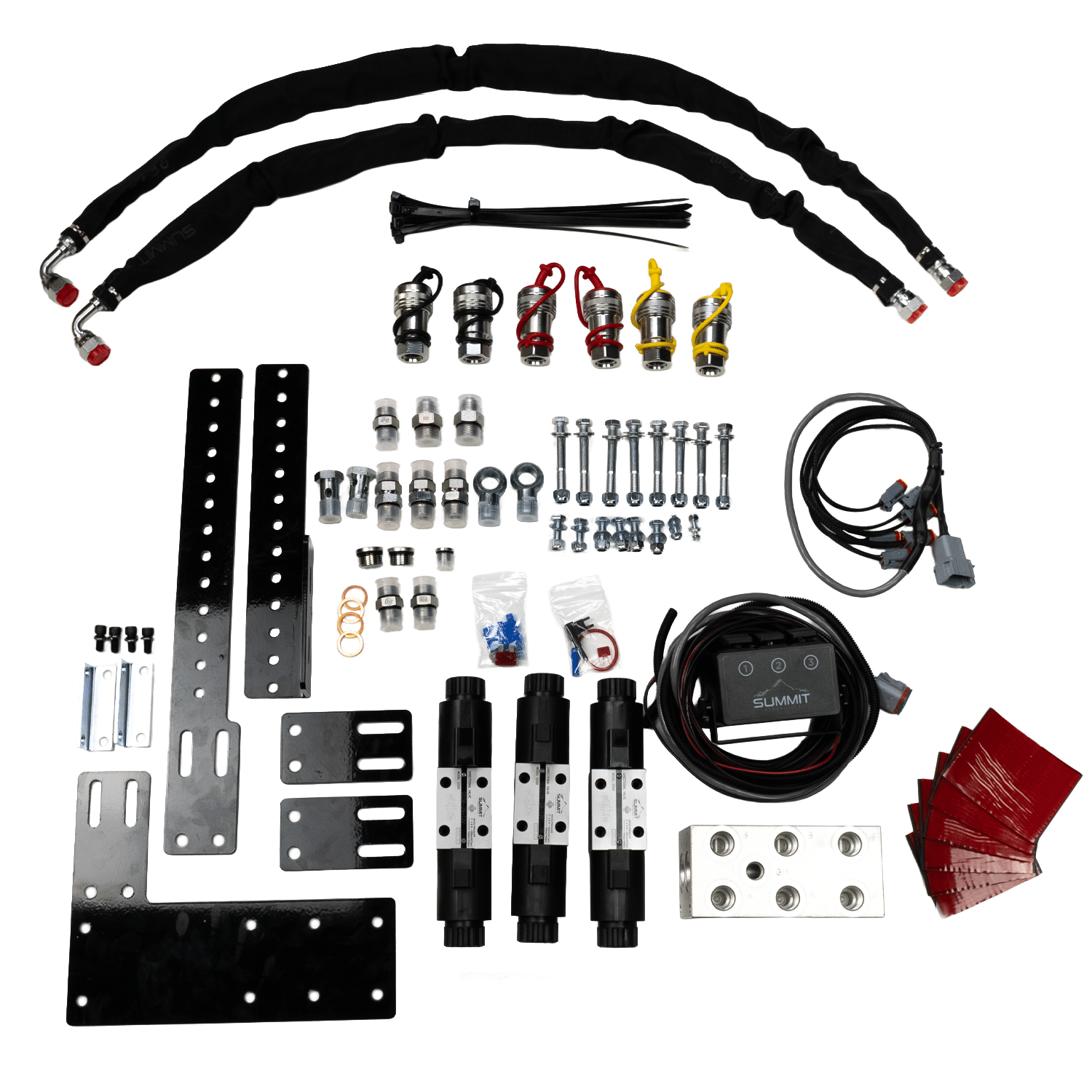This all-in-one rear remote valve kit is designed to install on Kioti CK2620SEH, CK3520SE, CK4020SE Series Tractors to add rear remote connections. This allows you to easily control various hydraulic implements in the rear using your OEM joystick and/or Summit Hydraulics switchbox controls. You can add two, three, or four rear remote coupler sets to your machine.